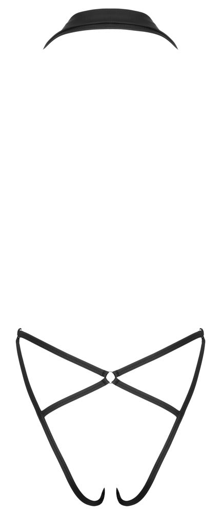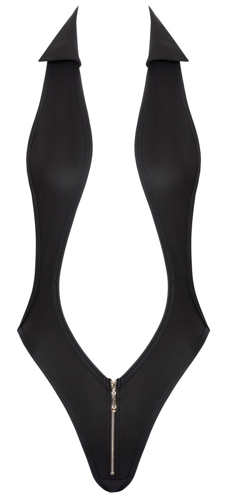 A breathtaking body from Cottelli PARTY in an elegant black matt look featuring a provocative cut with an open front and exposed back & butt. The halter neck with collar and zip above the pubic area are particularly stylish and erotic. The exposed butt is decorated with interlaced stretch bands and a silver-coloured ring holds everything nicely together.