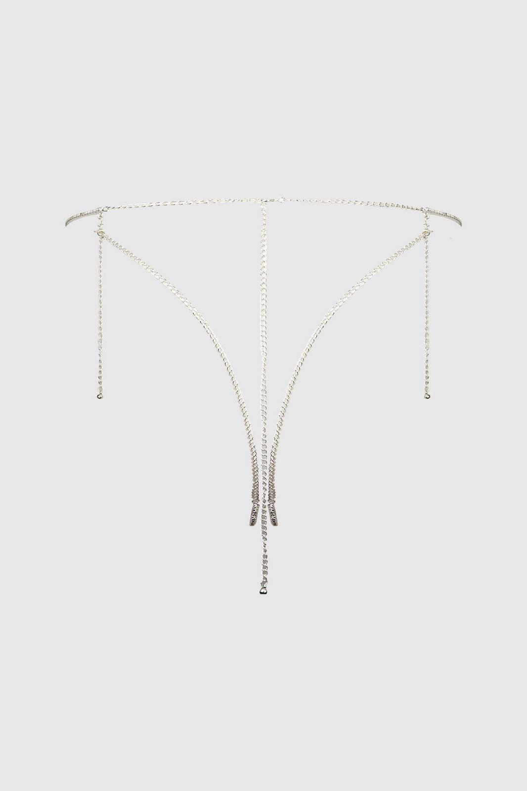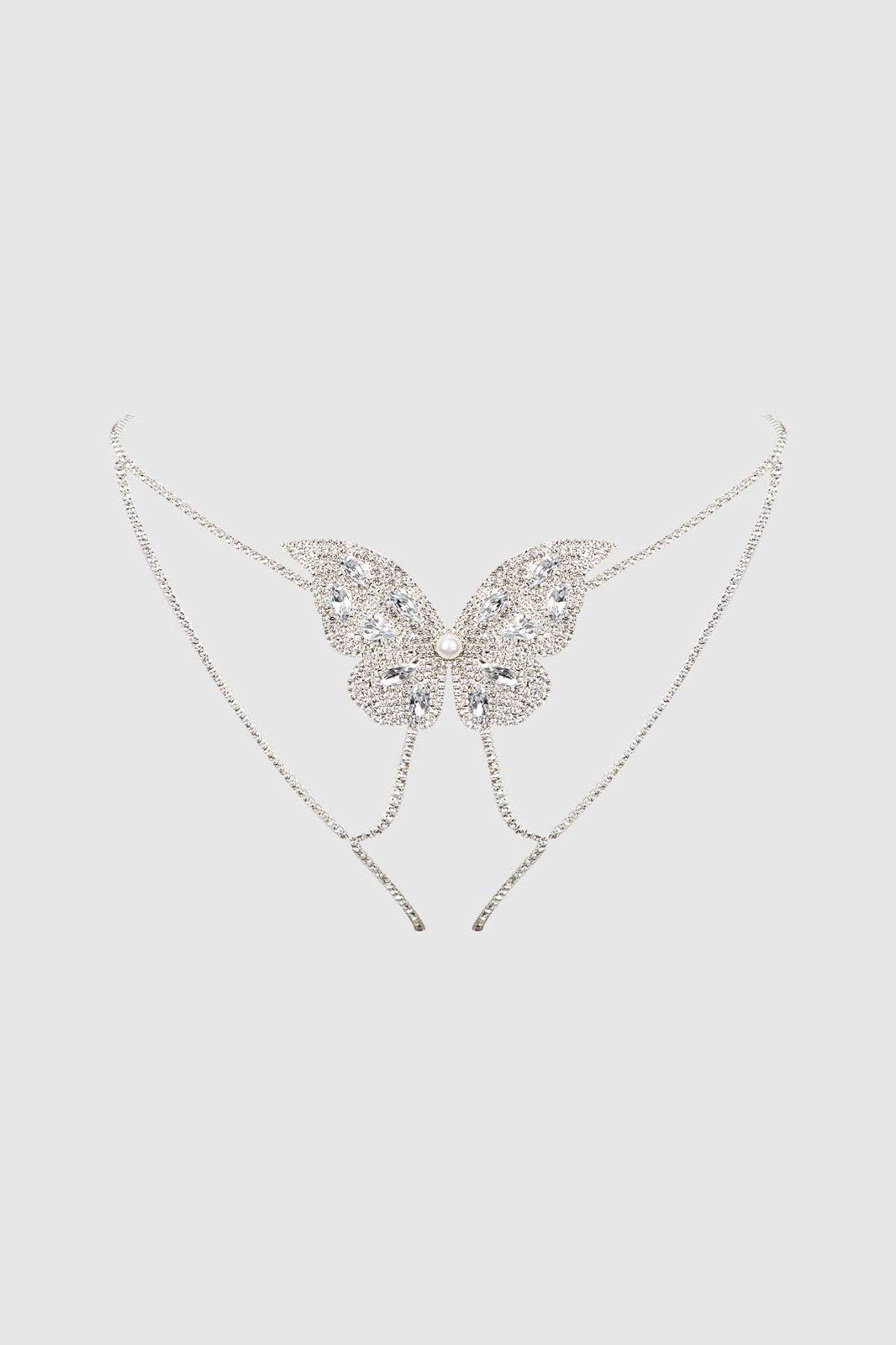 Add a daring spark to your intimate moments with the Rhinestone & Pearl Butterfly Panty. The captivating butterfly motif rests effortlessly on glittering rhinestone straps, highlighting your curves with irresistible allure. A pearl detail adds a sophisticated shine. Designed for a flattering draped fit, adjustable at the back for a perfect match, and crafted from lightweight materials for comfort. Care: spot clean only. Elevate your seduction game with this glamorous piece.