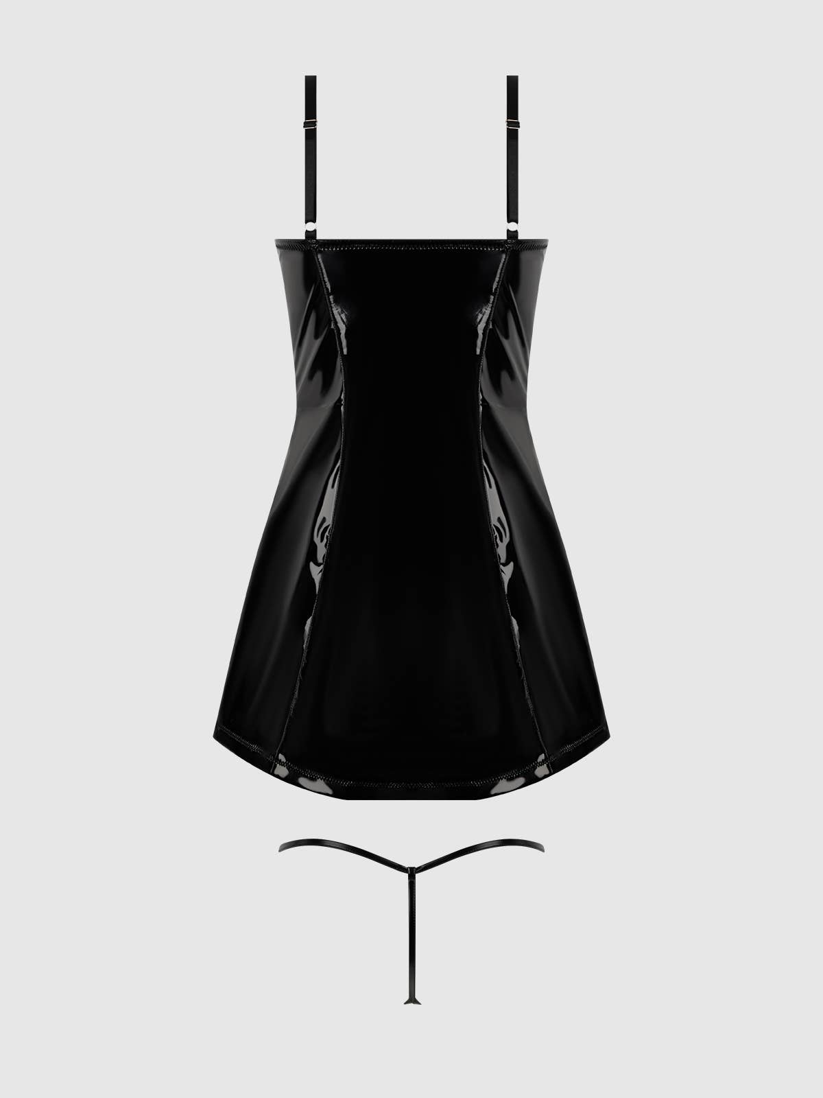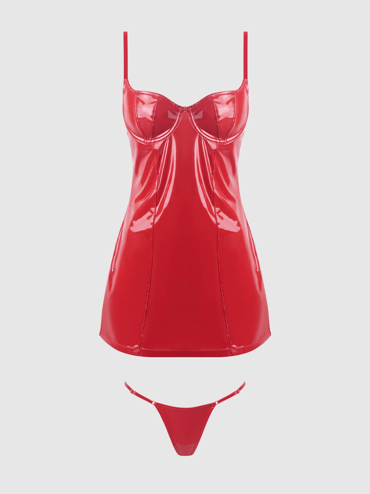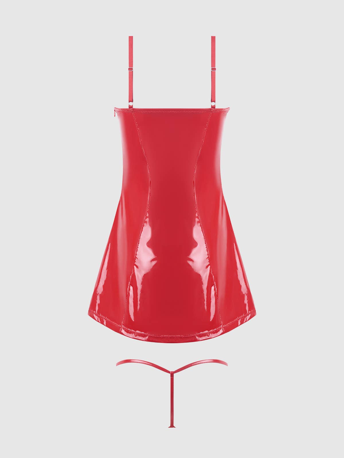 Step into seduction with the bold Patent Chemise Dress. Crafted from glossy, stretch patent vinyl, this slip features a dramatic plunge sweetheart neckline and wired cups for flawless support. Its sleek, body-hugging design accentuates your curves while the matching G-string completes the irresistible look. Perfect with daring red lips and sleek thigh-high boots, this set is made to own the night. Details include a high-shine, 4-way stretch fabric, unlined wired cups with adjustable straps, a concealed side zipper, and a two-piece ensemble of chemise and G-string.