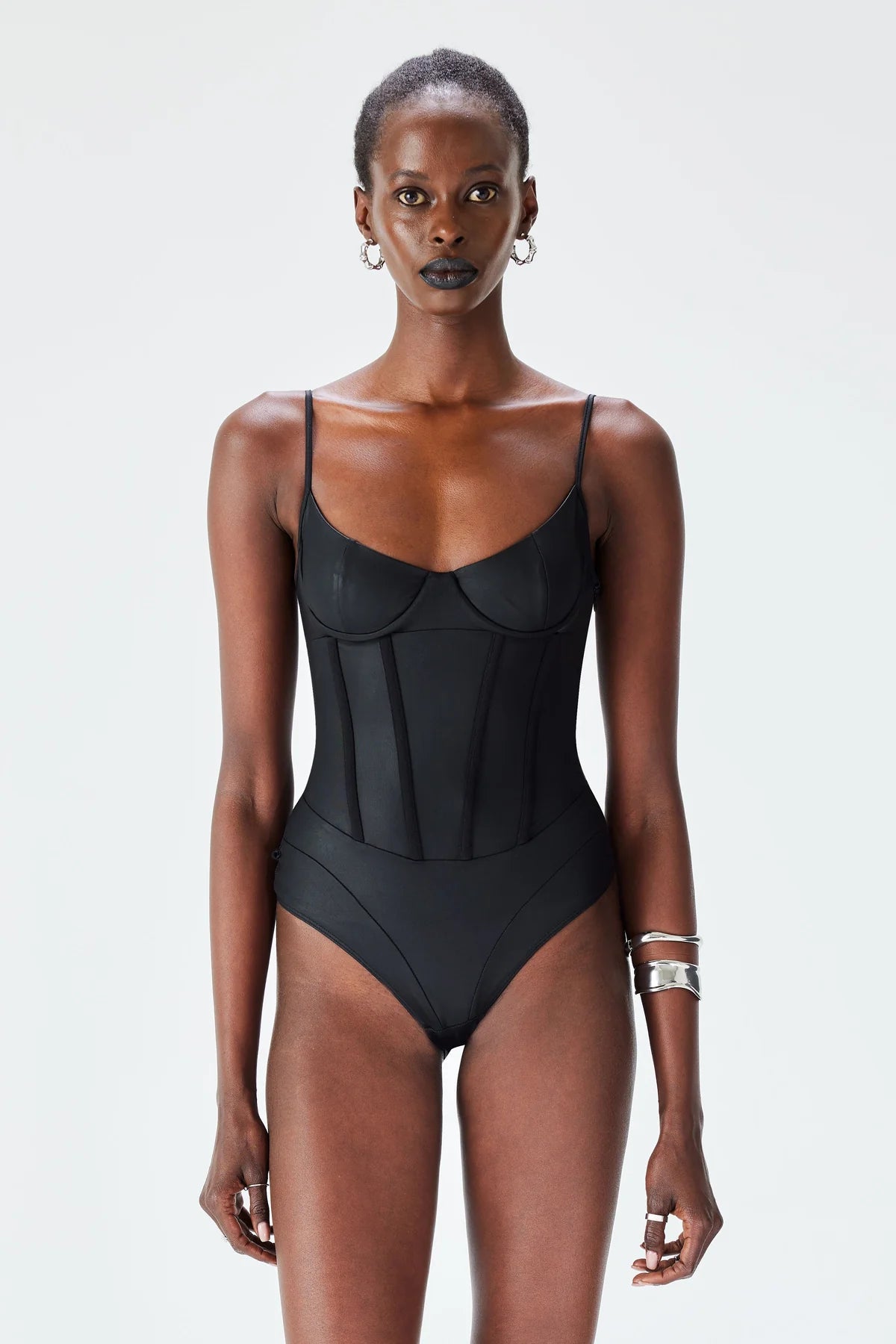Sleek corset-inspired dress with adjustable back lacing for a custom fit and removable skirt for versatile styling. The 90% polyamide, 10% elastane blend delivers a luxurious leather effect with medium stretch for comfort and movement. Perfect for nights out, dates, or making a bold statement. Transform one piece into two looks with effortless elegance.