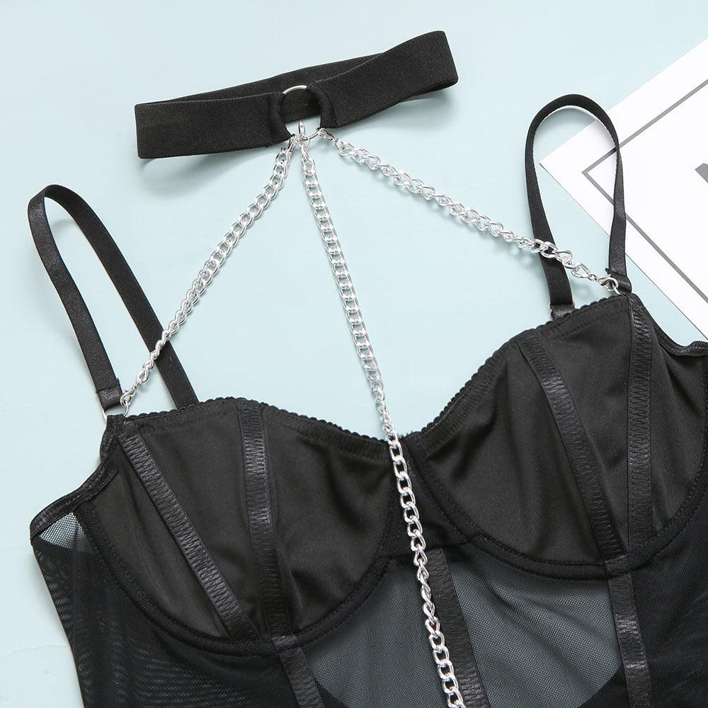 Der detaillierte Kettengürtel ist das Highlight dieses Bodysuits und strahlt eine einzigartige Mischung aus Raffinesse und Stärke aus. Der elastische Choker ergänzt das Design und verleiht dem Look eine moderne, verführerische Note.