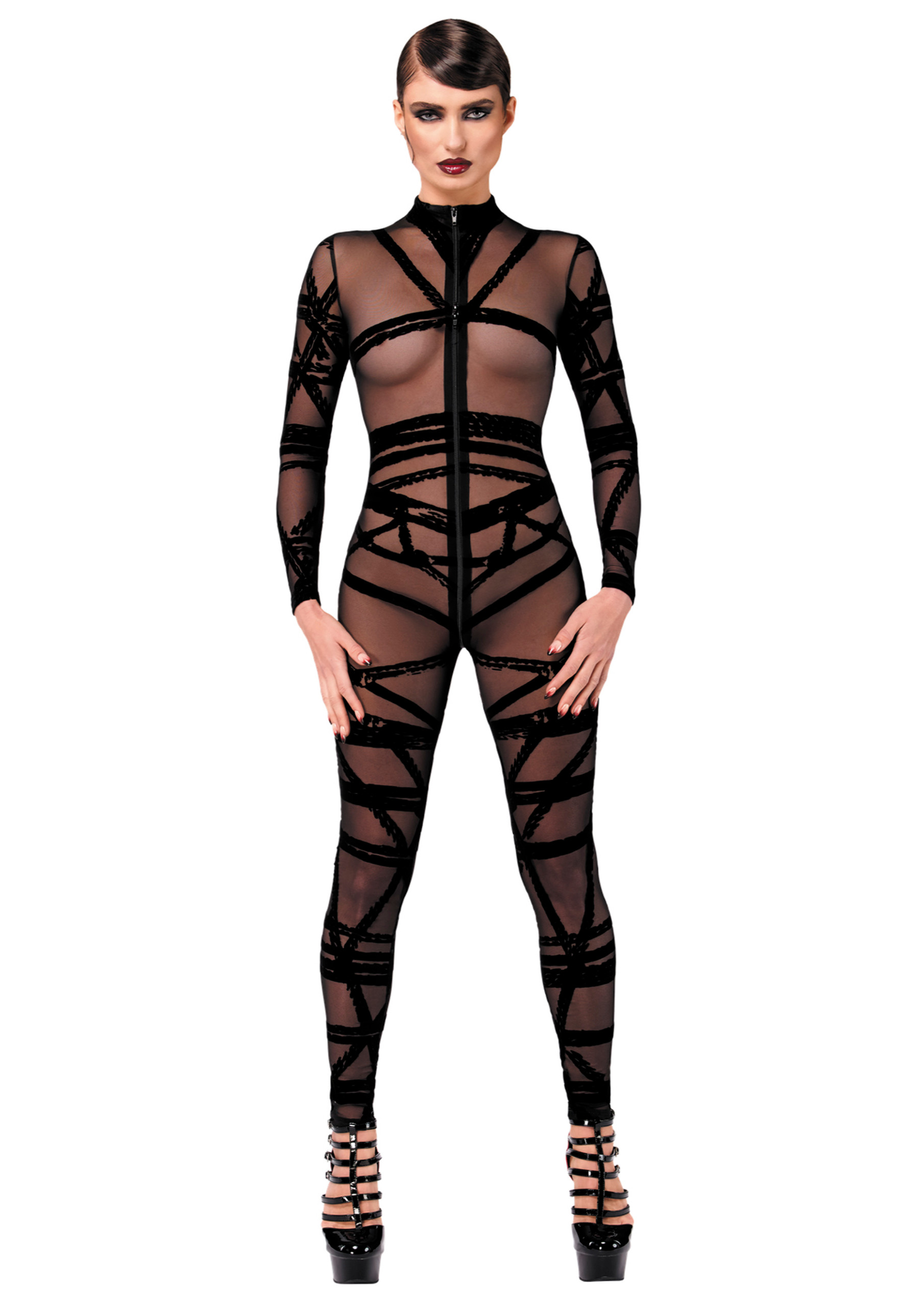 Step into the art of seduction with this stunning jumpsuit crafted from bondage-style flocked tulle. Inspired by the intricate beauty of Shibari, its design wraps the body like delicate ropes, creating a captivating visual effect. Featuring long sleeves and legs for a sleek silhouette, the three-way zipper offers customizable exposure and effortless access—perfect for those who want to tease and empower with every move.