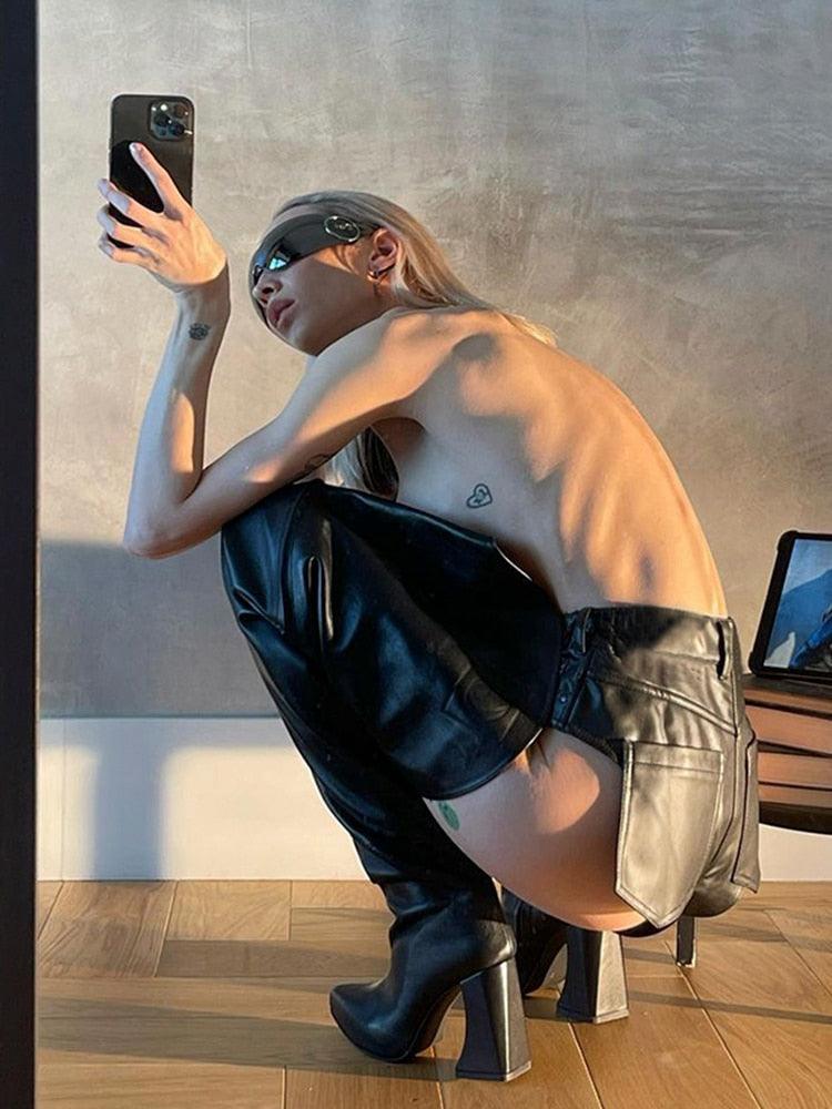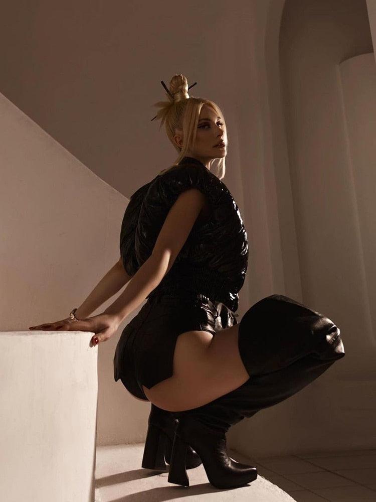 Crafted from a blend of polyester and spandex, these high-waisted shorts feature a sleek, solid design with a skinny fit that hugs your legs. Equipped with pockets and a zipper closure, they combine practicality with bold style. Their knitted fabric and regular fit make them a daring choice for your wardrobe.