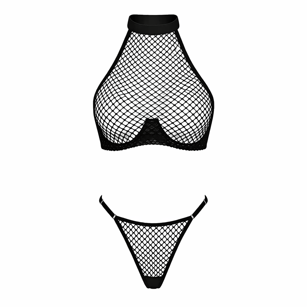 Das Nexus Set von Pole von Berlin legt ein geometrisches Netz über den Körper und verwandelt Haut in Architektur. Das schwarze, grobmaschige Material zeichnet klare Linien, während der haltergeschnittene Kragen den Oberkörper fest einrahmt. Die offenen Brustpartien brechen jede Erwartung von klassischer Lingerie und setzen den Fokus kompromisslos auf Präsenz.