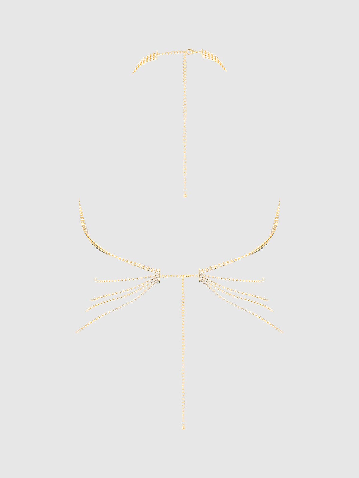 • Crafted in gold chains • Triangle open bottom cups with a caged chain pattern • Chain draping on the torso • Lobster back clasp with backless design