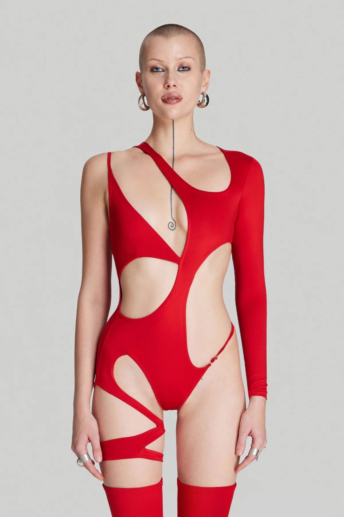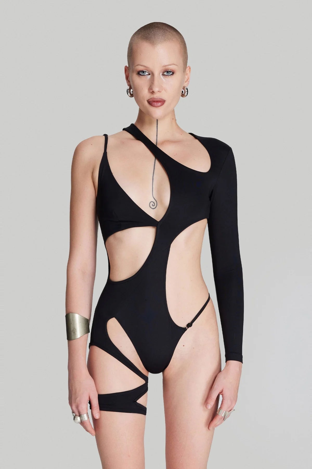 Trinity Body ist ein Statement-Piece für unvergessliche Nächte. Das einseitig ärmellose Design mit asymmetrischem Ausschnitt und seitlichen Cut-outs setzt mutige Akzente, während integrierte Garter-Details und Thong-Schnitt für eine durchdachte Silhouette sorgen. Die hochwertige Mischung aus 90% Polyamid und 10% Elastan bietet angenehme Dehnbarkeit und einen subtilen Glanz, der unter Licht wunderbar zur Geltung kommt. Perfekt für Partys, Festivals und jeden Moment, in dem du im Mittelpunkt stehen möchtest.