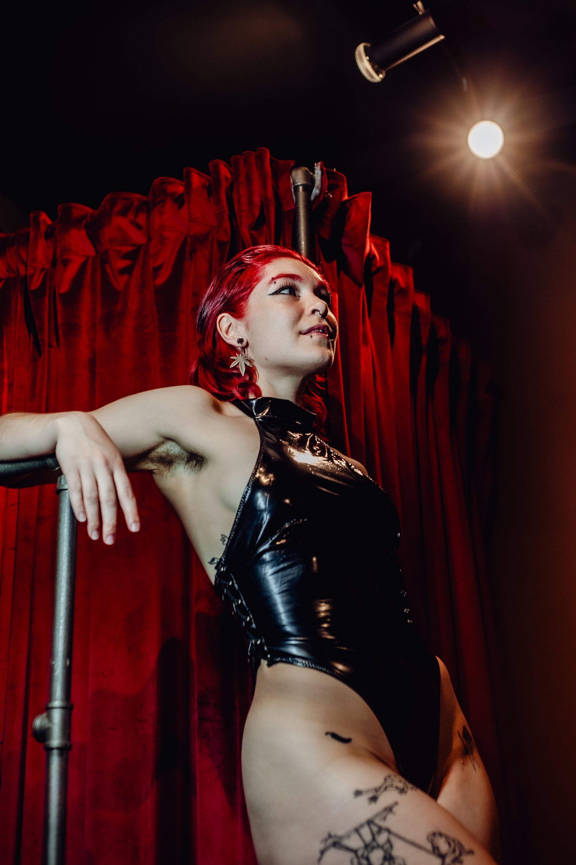 Defy expectations and let temperatures rise as you enter the room in this Bodysuit. This glossy vinyl teddy features a high halter neckline and a daring backless design. Adjustable lace-up sides ensure a perfect fit, while the high-cut thong silhouette will make your legs go on for miles. Perfect for nights when you're ready to break all the rules.