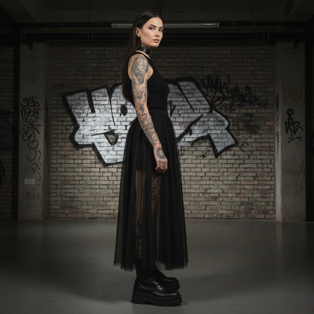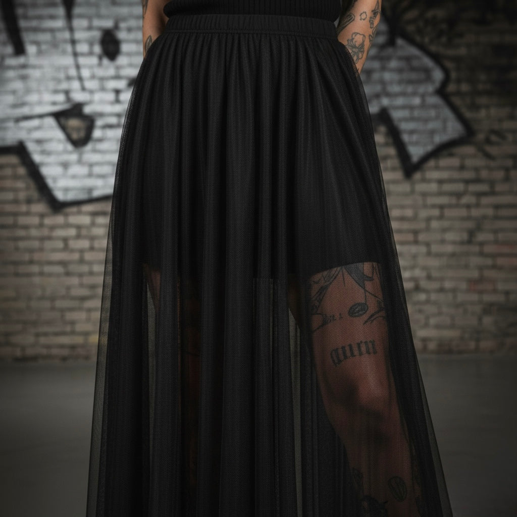 Sheer tulle layers create an alluring silhouette that demands attention. This long skirt balances boldness with elegance—the see-through design invites layering over fitted basics or wearing solo for maximum impact. Lightweight and flowing, it moves with confidence and captures light beautifully. Perfect for those ready to make a statement with their style.